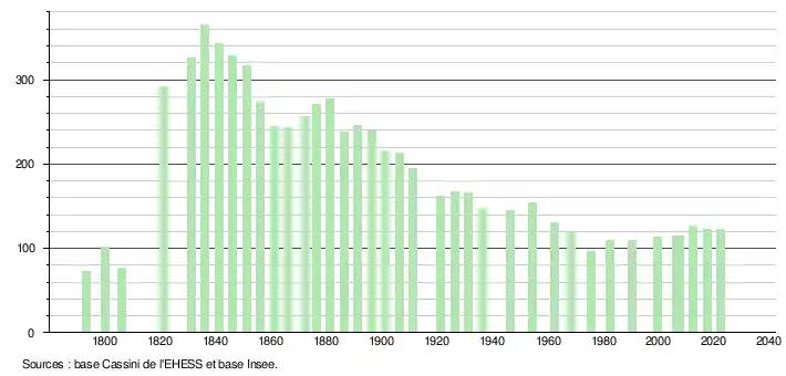 L'évolution du nombre d'habitants est connue à travers les recensements de la population effectués dans la commune depuis 1793. Pour les communes de moins de 10 000 habitants, une enquête de recensement portant sur toute la population est réalisée tous les cinq ans, les populations de référence des années intermédiaires étant quant à elles estimées par interpolation ou extrapolation[16]. Pour la commune, le premier recensement exhaustif entrant dans le cadre du nouveau dispositif a été réalisé en 2007[17].