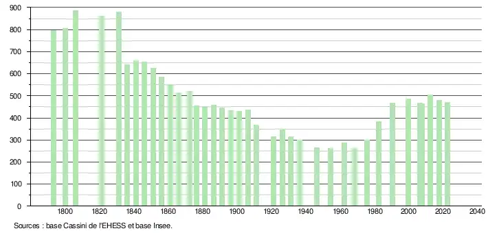 L'évolution du nombre d'habitants est connue à travers les recensements de la population effectués dans la commune depuis 1793. Pour les communes de moins de 10 000 habitants, une enquête de recensement portant sur toute la population est réalisée tous les cinq ans, les populations de référence des années intermédiaires étant quant à elles estimées par interpolation ou extrapolation[20]. Pour la commune, le premier recensement exhaustif entrant dans le cadre du nouveau dispositif a été réalisé en 2007[21].
