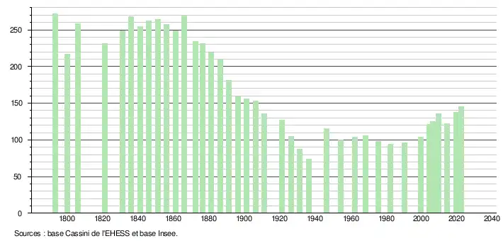 L'évolution du nombre d'habitants est connue à travers les recensements de la population effectués dans la commune depuis 1793. Pour les communes de moins de 10 000 habitants, une enquête de recensement portant sur toute la population est réalisée tous les cinq ans, les populations de référence des années intermédiaires étant quant à elles estimées par interpolation ou extrapolation[39]. Pour la commune, le premier recensement exhaustif entrant dans le cadre du nouveau dispositif a été réalisé en 2004[40].