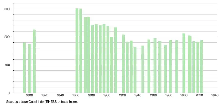 L'évolution du nombre d'habitants est connue à travers les recensements de la population effectués dans la commune depuis 1793. Pour les communes de moins de 10 000 habitants, une enquête de recensement portant sur toute la population est réalisée tous les cinq ans, les populations de référence des années intermédiaires étant quant à elles estimées par interpolation ou extrapolation[21]. Pour la commune, le premier recensement exhaustif entrant dans le cadre du nouveau dispositif a été réalisé en 2007[22].