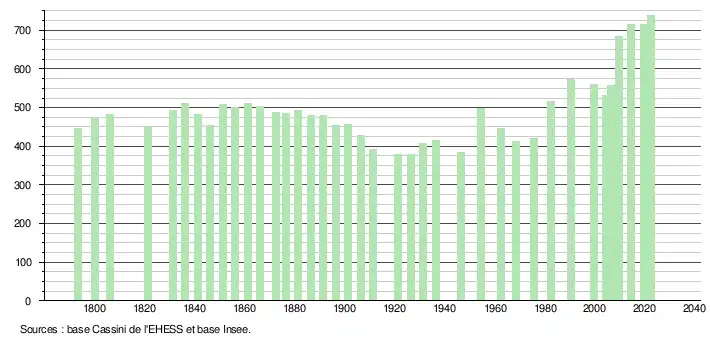 L'évolution du nombre d'habitants est connue à travers les recensements de la population effectués dans la commune depuis 1793. Pour les communes de moins de 10 000 habitants, une enquête de recensement portant sur toute la population est réalisée tous les cinq ans, les populations de référence des années intermédiaires étant quant à elles estimées par interpolation ou extrapolation[16]. Pour la commune, le premier recensement exhaustif entrant dans le cadre du nouveau dispositif a été réalisé en 2004[17].