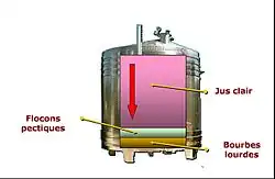 Les bourbes sédimentées en fond de cuve peuvent ensuite être filtrées sur filtre rotatif sous vide ou filtre presse pour être réincorporées dans les jus clairs avant fermentation.
