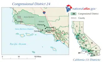 Depuis le redécoupage de 2020, le 24e district congressionnel de Californie est situé à l'extrémité sud de la côte centrale. Il englobe le Comté de Santa Barbara, la majeure partie du Comté de San Luis Obispo et une partie du Comté de Ventura. Le district comprend également six des îles anglo-normandes.