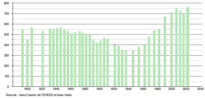 L'évolution du nombre d'habitants est connue à travers les recensements de la population effectués dans la commune depuis 1793. Pour les communes de moins de 10 000 habitants, une enquête de recensement portant sur toute la population est réalisée tous les cinq ans, les populations de référence des années intermédiaires étant quant à elles estimées par interpolation ou extrapolation[16]. Pour la commune, le premier recensement exhaustif entrant dans le cadre du nouveau dispositif a été réalisé en 2006[17].