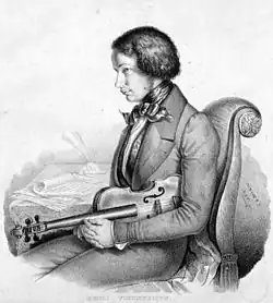 Alors que l'école française de violon devait conquérir une place de plus en plus prééminente durant l'ensemble du XIXe siècle, grâce notamment à la fondation du Conservatoire de Paris, en 1795, c'est encore l'école italienne qui fournit au monde du violon d'alors, en la personne du virtuose Niccolò Paganini (1782-1840), l'un de ses plus remarquables talents. La publication de ses 24 Caprices pour violon solo, opus 1, et de ses concertos pour violon, marque une avancée décisive dans les possibilités virtuoses de l'instrument, préparant celui-ci au répertoire flamboyant du XIXe siècle, en introduisant notamment des pizzicati de la main gauche, des coups d'archets en ricochets, des doubles cordes harmoniques… C'est pourquoi Paganini représente dans l'imaginaire romantique la « virtuosité transcendante quasi diabolique »[24]. Ses seuls élèves connus, Camillo Sivori (1815-1894) et Antonio Bazzini (1818-1897) devaient poursuivre l'œuvre du maître, mais l'on peut affirmer que la carrière brillante de Paganini marque la fin de la grande école de violon italienne[25].