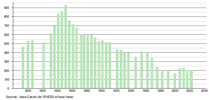 L'évolution du nombre d'habitants est connue à travers les recensements de la population effectués dans la commune depuis 1793. Pour les communes de moins de 10 000 habitants, une enquête de recensement portant sur toute la population est réalisée tous les cinq ans, les populations de référence des années intermédiaires étant quant à elles estimées par interpolation ou extrapolation[15]. Pour la commune, le premier recensement exhaustif entrant dans le cadre du nouveau dispositif a été réalisé en 2006[16].