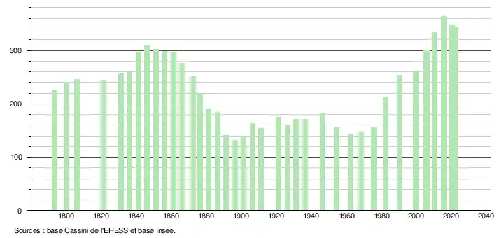 L'évolution du nombre d'habitants est connue à travers les recensements de la population effectués dans la commune depuis 1793. Pour les communes de moins de 10 000 habitants, une enquête de recensement portant sur toute la population est réalisée tous les cinq ans, les populations de référence des années intermédiaires étant quant à elles estimées par interpolation ou extrapolation[24]. Pour la commune, le premier recensement exhaustif entrant dans le cadre du nouveau dispositif a été réalisé en 2005[25].