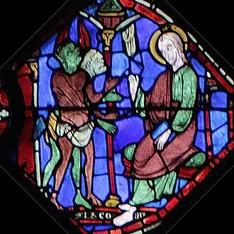 Un groupe de trois personnages présente le suaire à Philétus, toujours gisant à terre mais qui se redresse à présent. Au-dessus de lui, un diablotin jaune s'échappe, tenant sa tête entre ses mains. L'ouverture rouge derrière lui semble ici être une cheminée, évoquant probablement la porte de l'enfer vers lequel le diablotin va repartir. Ici, l'artiste interprète nettement le « suaire » comme une chemise, allusion probable à la relique de la tunique de la Vierge conservée à Chartres. |