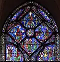 Cette verrière est composée de quatre étages sensiblement carrés. Au centre de chaque étage, quatre panneaux losangés sont posés en croix, autour d'un médaillon circulaire à fond rouge bordé de bleu et chargé d'un motif floral. Ces panneaux centraux sont à fond bleu, bordés vers l'extérieur de deux filets rouge et blanc, qui s'arrondissent et dessinent un pétale au point de rencontre des panneaux. Aux quatre cantons de la croix centrale, quatre autres scènes s'inscrivent sur fond bleu dans des demi-quadrilobes latéraux, bordées vers l'extérieur d'un filet rouge et d'une bordure bleue semée de perles jaunes.