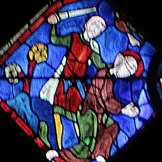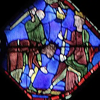 Josias est projeté à terre par son bourreau, qui lui tire les cheveux en arrière tout en le frappant avec une pierre. Son visage ensanglanté est légèrement teinté de rouge, ce qui est remarquable pour les techniques verrières de cette époque. |