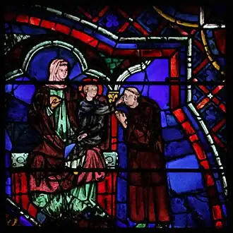 On peut cependant remarquer la grande similitude qu'il y a entre ce panneau et le panneau symétrique du vitrail des saintes Marguerite et Catherine, de l'autre côté de la chapelle : outre que ces deux vitraux présentent les mêmes fonds et les mêmes motifs de bordure dans les panneaux historiés, les deux donateurs sont représentés dans la même attitude de prière devant une vierge à l'enfant, figurant très probablement la statue de Notre-Dame sous terre, statue du XIe siècle brûlée par les vandalismes de 1793[2].