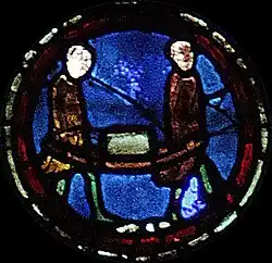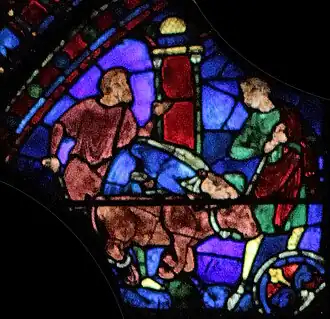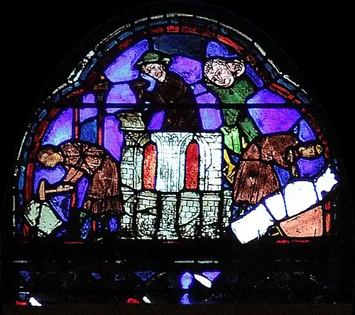 À gauche, deux manœuvres transportent un bloc de pierre sur un brancard. D'après l'iconographie représentant les chantiers de l'époque, la brouette serait apparue dans la seconde moitié du XIIIe siècle, une cinquantaine d'années après la construction de la cathédrale et la réalisation de ce vitrail.