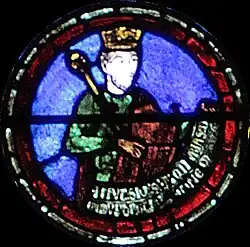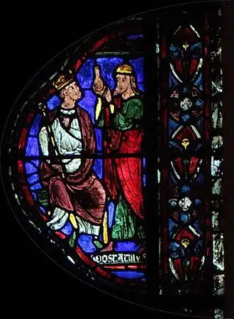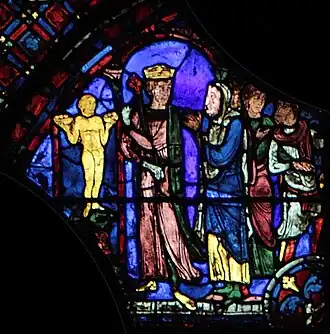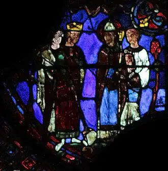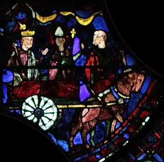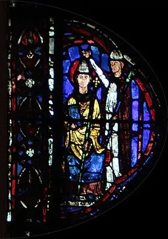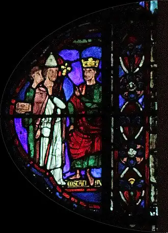 Charlemagne, dont le vitrail fait le pendant de celui-ci dans le déambulatoire nord, marquera ultérieurement une étape ultérieure pour l'occident au VIIIe siècle : c'est par sa dynastie que l'onction a été systématiquement introduite dans le sacre royal, manifestant un basculement dans la légitimité du pouvoir ; par son sacre religieux, le Roi tient son ministère de Dieu (par l’intermédiaire de l’Église), il a pour vocation à ce titre d'être le bras armé de l’Église dans le monde, consacrant la « conception ministérielle de la royauté »[4]. Ces deux vitraux illustrent donc le rapport entre l'autorité spirituelle de l'Église et l'autorité temporelle du souverain au XIIIe siècle, tel qu'il était enseigné par l'Église. Par la suite, la donation de Constantin, apparaissant vers le IXe siècle et dont le caractère inauthentique ne sera établi qu'au XVe siècle, tente de faire remonter cette conception à Constantin lui-même, qui par ce testament inventé sous les carolingiens aurait légué son pouvoir temporel à l'autorité de l'Église.
