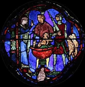 Une autre version rapportée par des païens de la ville d'Harran prétend que Constantin, alors atteint de lèpre, se serait converti car les chrétiens acceptaient dans leur rang les lépreux. Il aurait dû pour se soigner prendre un bain du sang de nouveau-nés mais, touché par les pleurs des mères, ne put s'y résoudre. C'est alors que lui seraient apparus en songe la nuit suivante saint Pierre et saint Paul qui lui conseillèrent de retrouver l’évêque Sylvestre sur le mont Soracte : lors de cette rencontre l'empereur Constantin fut baptisé et soigné de sa terrible maladie[9],[10]. C'est cette version, déjà présente dans la donation de Constantin, qui est reprise dans la Légende dorée et qui est illustrée dans le présent vitrail. Ce thème, suggérant évidemment celui du massacre des Innocents, permet de faire le parallèle entre le « mauvais roi » Hérode le Grand, qui n'a pas hésité à massacrer la population pour refuser la venue annoncée du Christ, et le « bon empereur » Constantin, qui face à cette même annonce se convertit et devient le protecteur de l'Église.