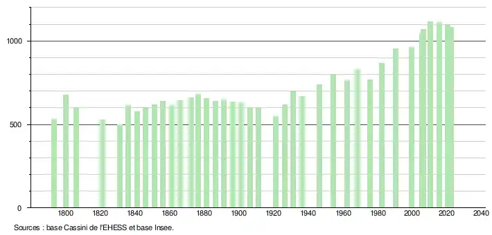 L'évolution du nombre d'habitants est connue à travers les recensements de la population effectués dans la commune depuis 1793. Pour les communes de moins de 10 000 habitants, une enquête de recensement portant sur toute la population est réalisée tous les cinq ans, les populations de référence des années intermédiaires étant quant à elles estimées par interpolation ou extrapolation[16]. Pour la commune, le premier recensement exhaustif entrant dans le cadre du nouveau dispositif a été réalisé en 2005[17].