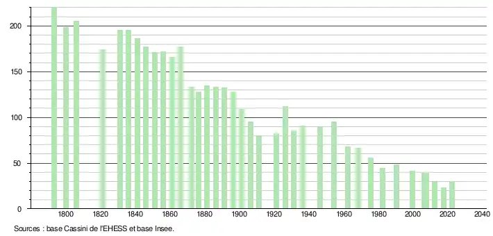 L'évolution du nombre d'habitants est connue à travers les recensements de la population effectués dans la commune depuis 1793. Pour les communes de moins de 10 000 habitants, une enquête de recensement portant sur toute la population est réalisée tous les cinq ans, les populations de référence des années intermédiaires étant quant à elles estimées par interpolation ou extrapolation[15]. Pour la commune, le premier recensement exhaustif entrant dans le cadre du nouveau dispositif a été réalisé en 2007[16].