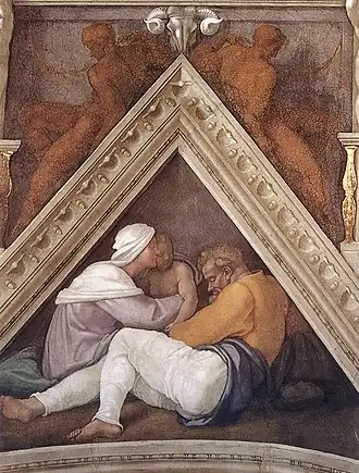 L'identité des personnages de la lunette en-dessous n'est pas établie avec certitude, mais la famille de Jéchonias est généralement identifiée dans le voûtain, représenté avec sa femme et son fils Salathiel .