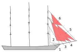 - Trinquette (le plus à l'arrière)[1] parfois monté sur une bôme à l'avant d'un mât[1].