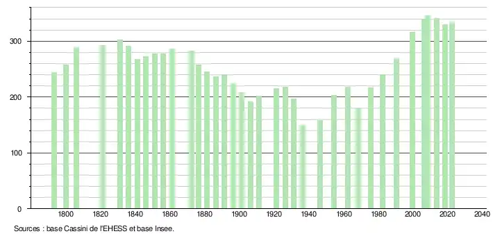L'évolution du nombre d'habitants est connue à travers les recensements de la population effectués dans la commune depuis 1793. Pour les communes de moins de 10 000 habitants, une enquête de recensement portant sur toute la population est réalisée tous les cinq ans, les populations de référence des années intermédiaires étant quant à elles estimées par interpolation ou extrapolation[19]. Pour la commune, le premier recensement exhaustif entrant dans le cadre du nouveau dispositif a été réalisé en 2008[20].