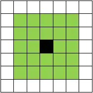 Le voisinage de Moore d'ordre 2 d'une cellule est constitué de la cellule centrale et des vingt-quatre cellules qui l'entourent.