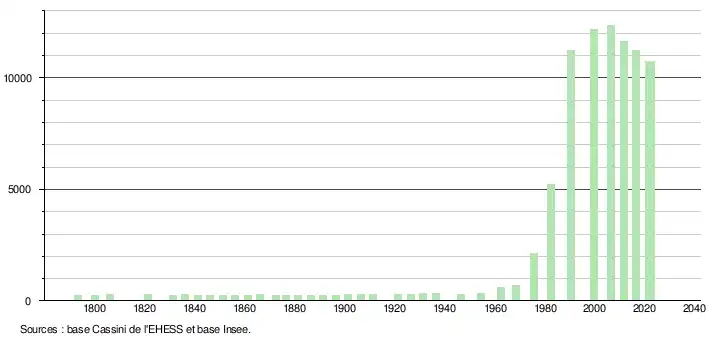 - ↑ Par convention dans Wikipédia, le principe a été retenu de n’afficher dans le tableau des recensements et le graphique, pour les populations de référence postérieures à 1999, que les populations correspondant à une enquête exhaustive de recensement pour les communes de moins de 10 000 habitants, et que les populations des années 2006, 2011, 2016, etc. pour les communes de plus de 10 000 habitants, ainsi que la dernière population de référence publiée par l’Insee pour l'ensemble des communes.