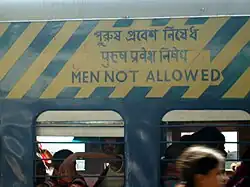 À Bombay, tous les trains de banlieue sont dotés de compartiments réservés aux femmes, même si les enfants en âge d'aller à l'école peuvent aussi y monter. Deux compartiments sont réservés aux femmes pendant 24 heures et un autre leur est réservé à des horaires spécifiques. Les compartiments pour femmes sont des voitures de première et deuxième classe. Aux heures de pointe, il existe aussi trois ou quatre rames entièrement réservées aux femmes. Comme le nombre de voyageuses a doublé dans les années 2000, la demande est forte pour de type de service[10]. De nombreux trains présentent des compartiments pour femmes comme, entre autres, le métro de Bombay et le métro de Delhi[11]. Ce mouvement a aussi conduit à l'établissement de taxis pour femmes : les tuk-tuk roses (en)[12].