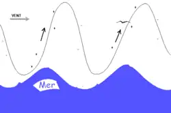 En effet, sous le vent du relief, et sous certaines conditions, se produisent un ou plusieurs ressauts, du fait de l'élasticité de l'air[Faux]. Ces ondes peuvent atteindre de grandes altitudes, largement supérieures à celle du relief générateur. Ces zones de ressauts sont parfois matérialisées par des nuages particuliers appelés lenticulaires, nuages de forme très régulière, parfois en pile d'assiettes, anormalement immobiles alors que le vent souffle avec intensité.