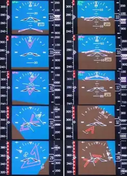 Reconstitution des indications des deux horizons artificiels lors de l'évènement qui a amené à la chute de l'avion. À droite, l'horizon artificiel du copilote, qui affichait l'avion dans une position stable et en palier. À gauche, l'horizon artificiel du commandant qui indiquait, à cause d'une erreur dans la centrale inertielle, que l'avion montait subitement. Dans la nuit noire, le commandant a appliqué un mouvement à piquer sur l'avion car son instrument lui montrait, à tort, qu'il montait dangereusement. Le piqué déclenché est visible sur l'instrument du copilote, qui affichait les bonnes informations.