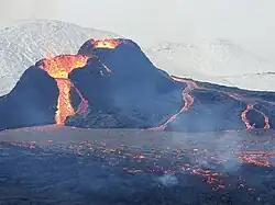 Après trois semaines de forte activité sismique, une fissure s'est ouverte près du Fagradalsfjall dans la péninsule de Reykjanes[17]. Le 19 mars 2021, une coulé de lave provenant d'une faille de 200 mètres de long, a été découverte par une patrouille d'hélicoptère des gardes-côtes islandais près de Grindavík. En quelques heures, la faille s'est élargie pour atteindre 500 mètres de longueur[18].