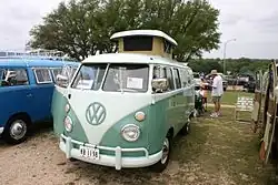 - 3-1 Camper Van T1, Samba, Combi Split, déjà aménagé par la société anglaise Devon, dans le Kent à Ramsgate. Il disposait de deux portes centrales latérales ouvrant en livre pour accéder à la cellule de vie. Ce modèle offre une possibilité de couchage pour deux adultes et un enfant, le dossier articulé de la banquette avant permettant d'accueillir ce dernier dans la cellule de conduite.