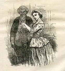 Le Moine de Calais (1780) par Angelica Kauffmann, montrant le révérend Yorick échangeant sa tabatière avec le frère Lorenzo : « Il avait une tabatière de corne à la main. Il me la tendit, ouverte. - Vous goûterez le mien, dis-je en tirant ma tabatière, qui était une petite boîte d'écaille, et je la lui mis dans la main. » | |