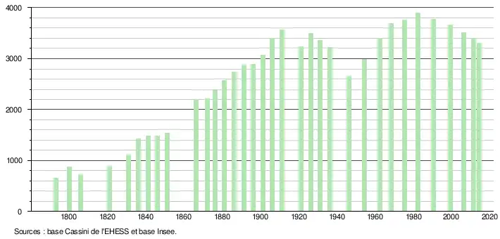 L'évolution du nombre d'habitants est connue à travers les recensements de la population effectués dans la commune depuis 1793. À partir du , les populations légales des communes sont publiées annuellement dans le cadre d'un recensement qui repose désormais sur une collecte d'information annuelle, concernant successivement tous les territoires communaux au cours d'une période de cinq ans. Pour les communes de moins de 10 000 habitants, une enquête de recensement portant sur toute la population est réalisée tous les cinq ans, les populations légales des années intermédiaires étant quant à elles estimées par interpolation ou extrapolation[16]. Pour la commune, le premier recensement exhaustif entrant dans le cadre du nouveau dispositif a été réalisé en 2006[17],[Note 1].
