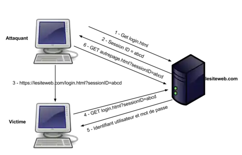 L’attaque par fixation de session est une attaque proche du vol de session. Cette attaque permet à une personne mal intentionnée de déterminer l'identifiant de session d'une autre personne. En connaissant le SID[Note 7] d’un utilisateur, il est possible de l’utiliser et de récupérer sa session pour soi. Cette attaque repose sur le fait que, lorsqu’un utilisateur s’authentifie, un nouveau SID ne lui est pas attribué, ce qui rend possible l’utilisation de son SID. Avec cette attaque, l’attaquant fixe le SID de l’utilisateur, avant même que celui-ci n’ouvre une session sur le serveur cible. Cette méthode évite ainsi à l’attaquant de devoir récupérer par la suite le SID de l’utilisateur. Pour ce faire, l’attaquant ouvre une session sur le serveur et obtient un SID valide. Puis, il transmet ce dernier à sa victime, à l’aide d’un lien, par exemple au travers d’un email. La victime clique sur le lien et se connecte au serveur. Une fois la connexion établie, l’attaquant peut envoyer de nouvelles requêtes aux serveurs et comme il possède le même SID, il a accès aux données. La session a été détournée[17].