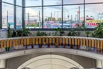 Elle dispose, en surface, d'un pavillon d'accès, en relation avec le quai de la station par un tunnel en pente équipé de trois escaliers mécaniques suivi d'un couloir et de deux escaliers fixes. Par ailleurs le hall est relié par un escalier fixe à un long passage souterrain piétonnier disposant de sept bouches de part et d'autre de la voie routière et des rails du tramway situés en surface[2].