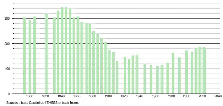 L'évolution du nombre d'habitants est connue à travers les recensements de la population effectués dans la commune depuis 1793. Pour les communes de moins de 10 000 habitants, une enquête de recensement portant sur toute la population est réalisée tous les cinq ans, les populations de référence des années intermédiaires étant quant à elles estimées par interpolation ou extrapolation[16]. Pour la commune, le premier recensement exhaustif entrant dans le cadre du nouveau dispositif a été réalisé en 2006[17].