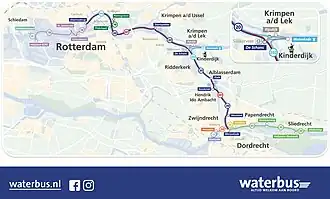 Le réseau de Waterbus est constitué d'une ligne principale entre Rotterdam et Dordrecht (ligne 20), quelques ferries dans la zone plus rurale de Drechtsteden (lignes 21 à 24) et d'un service traversier à l'intérieur de Rotterdam (ligne 19).