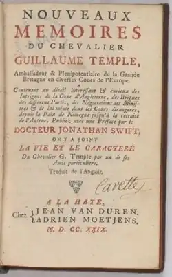 - Nouveaux Mémoires du Chevalier Guillaume Temple (1692) traduites en français en 1729 avec une préface de Jonathan Swift.