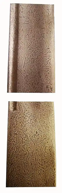 - La deuxième, qui utilise de l'« acier Damas de corroyage », emprunte le nom du métal historique par abus de langage à cause de sa ressemblance superficielle avec l'acier Damas wootz mais elle est totalement différente : le forgeron fabrique un mille-feuille en alternant des morceaux d'acier de compositions différentes, généralement un à haute teneur en nickel (couleur claire) et un peu allié à haute teneur en carbone (couleur sombre). Il soude ensuite ces morceaux d'acier entre eux. le motif observé sera alors linéaire. Il est ensuite possible de modifier le dessin, par exemple en torsadant le barreau d'acier feuilleté. Cette deuxième technique peut être appliquée à d'autres métaux (comme le mokume-gane pour les métaux non-ferreux ou le timascus pour le titane). En France, le savoir-faire lié à l'acier de Damas est inscrit à l'inventaire du patrimoine culturel immatériel. Il s'agit, bien sûr, exclusivement de Damas de corroyage.