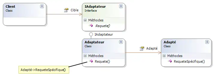 L’adaptateur fait fonctionner ensemble des classes qui n'auraient pas pu fonctionner sans lui, à cause d'une incompatibilité d'interfaces[2].