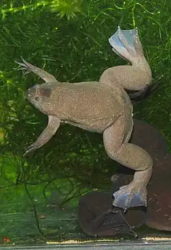 Xenopus tropicalis est une espèce d'amphibiens de la famille des Pipidae[1]. Ces crapauds griffus à peau lisse vivent dans des étangs et des mares en Afrique tropicale. Ils peuvent mesurer entre 4 et 6 cm.