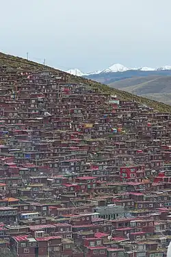 - ↑ (en) Daniel Peters, « Incredible images show the world's largest Buddhist settlement where thousands of tiny wooden huts line steep hillsides », sur Mail Online,