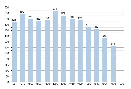 - Sources : INS, Rem. : 1831 jusqu'en 1970 = recensements, 1976 = nombre d'habitants au 31 décembre[2].