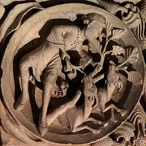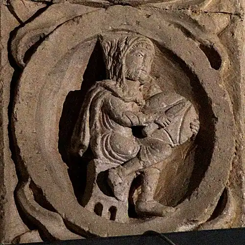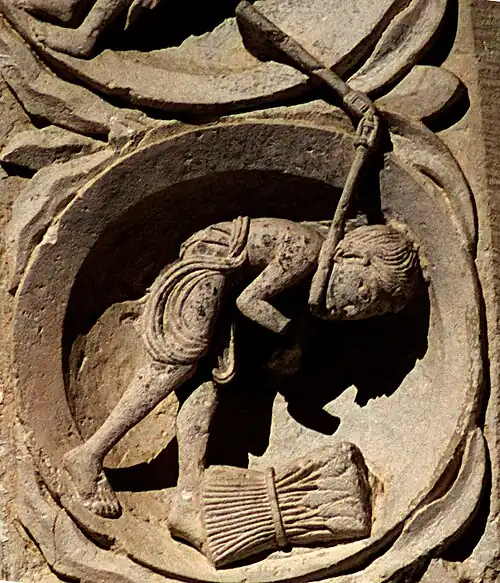Le médaillon est plus probablement à rapprocher de son symétrique du côté droit, qui représente un homme en train d'engranger la récolte. L'ensemble peut alors être compris comme une figure allégorique rappelant « si le grain de blé qui est tombé en terre ne meurt, il reste seul; mais, s'il meurt, il porte beaucoup de fruit » (Jn 12:24).