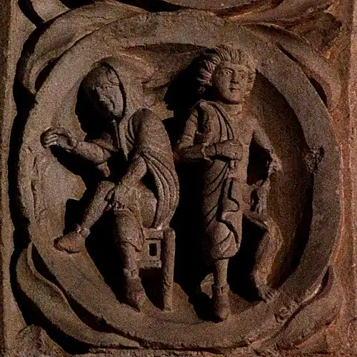 Dans le premier médaillon, un paysan coupe une miche de pain. La miche a une ornementation triangulaire, signe distinctif qui permet à son possesseur de reconnaître sa miche parmi d'autres dans un four communal. Découper le pain est une illustration de janvier, que l'on retrouve sur le tympan de la cathédrale d'Autun.