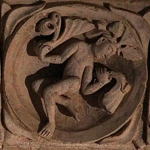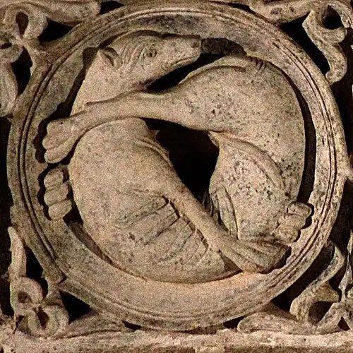 Après le chien se mordant la queue, deux médaillons représentent un acrobate se tenant les jambes, et une sirène se tenant la queue.