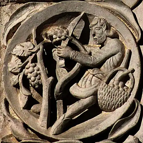 Pour septembre, entre vierge et balance, le tympan de Vézelay retient le battage du blé. Le fléau dépasse sur le médaillon précédent de la vierge. Un autre choix fréquent pour septembre est le thème des vendanges, retenu ici pour illustrer octobre.