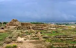 - Le bâtiment B, de plan rectangulaire, serait le temple d'origine. Cette thèse est étayée par des découvertes remontant au VIIIe siècle av. J.-C. ;