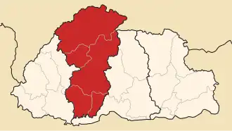 | Ouest | ![]() | Chukha Haa Paro Samtse Thimphou | Thimphou | 9 563 km2 | 460 000 |