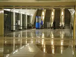 La station dispose, en surface, d'un hall d'accès au rez-de-chaussée d'un bâtiment commercial, il est en relation avec l'est du quai par un tunnel en pente équipé de quatre escaliers mécaniques[2].