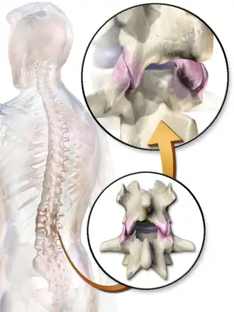Les articulations zygapophysaires sont des articulations de type synovial entre les quatre processus articulaires de deux vertèbres adjacentes. Elles sont planes au niveau cervical et thoracique et trochoïdes au niveau lombaire.